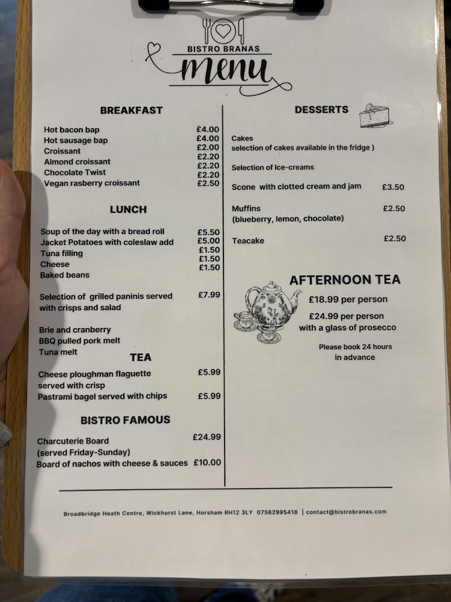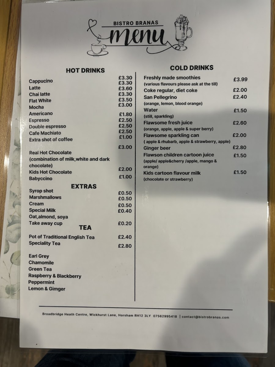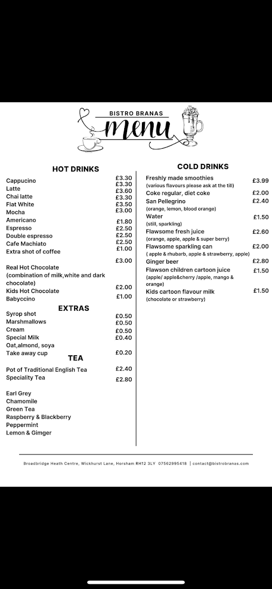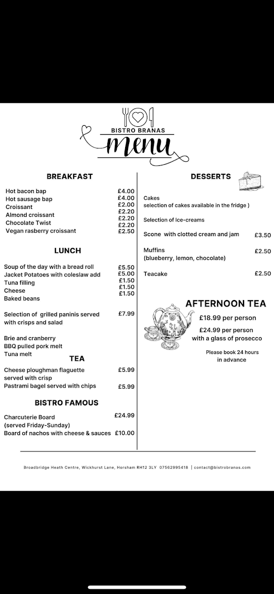 Welcome to Bistro Branas, a delightful café located in the Broadbridge Heath Centre in Horsham, United Kingdom. This family-friendly spot offers a menu that effortlessly blends hearty breakfasts and sweet treats to delight every palate. Start your morning with the luxurious Breakfast Royale, featuring a full English spread, or opt for the Small Appetite Breakfast for a lighter fare. Kids are catered for too with the Mini Munchers Breakfast, ensuring that even the youngest diners feel included.